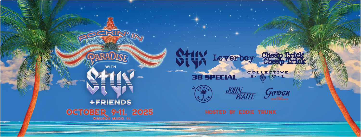 Rockin' in Paradise with Styx is a three-day beachside music getaway happening October 9–11, 2025 in Miramar Beach, Florida, featuring live performances by Styx in a laid-back, oceanfront setting.